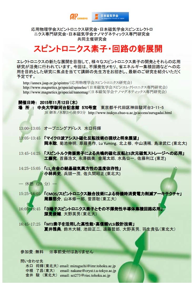 エレクトロニクスの新たな展開を目指して、様々なスピントロニクス素子の開発とそれらの応用研究が活発に行われています。今回は、不揮発性メモリ、省エネルギー集積回路などへの応用を目的とした研究に焦点を当てて講師の先生方をお招きし、最新のご研究を紹介いただきます。