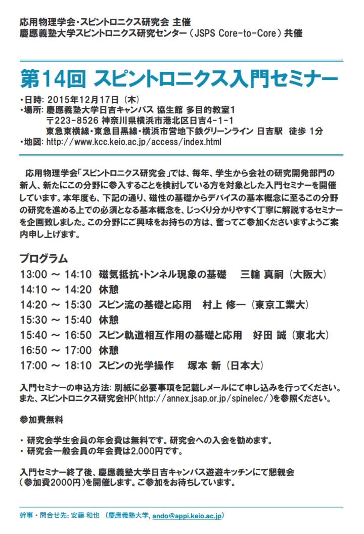 応用物理学会「スピントロニクス研究会」では、毎年、学生から会社の研究開発部門の新人、新たにこの分野に参入することを検討している方を対象とした入門セミナーを開催しています。本年度も、下記の通り、磁性の基礎からデバイスの基本概念に至るこの分野の研究を進める上での必須となる基本概念を、じっくり分かりやすく丁寧に解説するセミナーを企画致しました。この分野にご興味をお持ちの方は、奮ってご参加くださいますようご案内申し上げます。