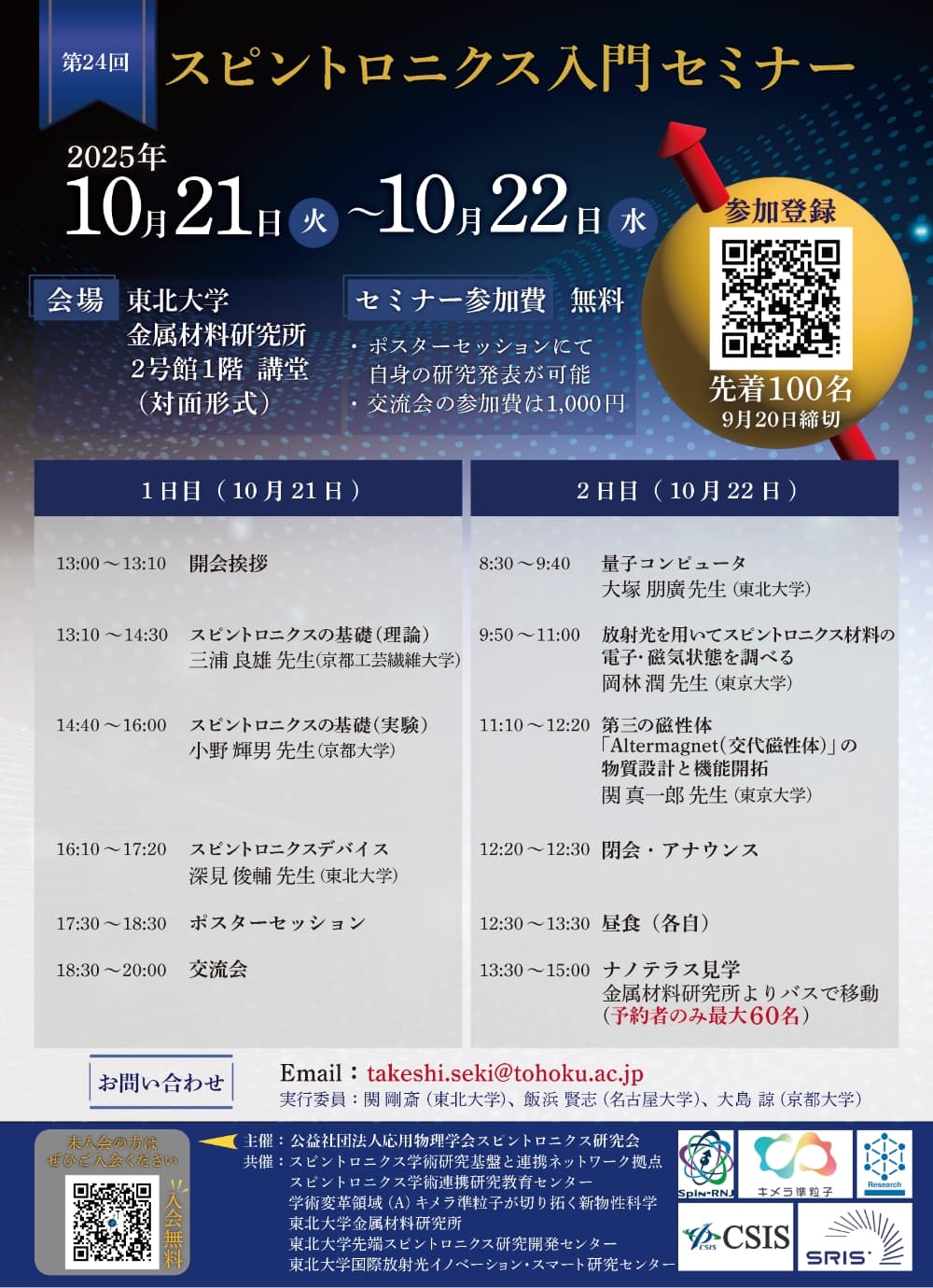 スピントロニクスは、電子スピンがもたらす新奇な物性を探究する理学と、MRAMなどへの応用を目指す工学の両輪によって急速に発展しているきわめてユニークな分野です。 近年では専門性が高まり、参入のハードルが上がりつつありますが、本入門セミナーでは、そのスピントロニクスの世界に足を踏み入れるための絶好の機会として、1泊2日の集中講義を開催いたします。 著名な講師陣による入門講義を、直接・対面で受講できる貴重な機会です。