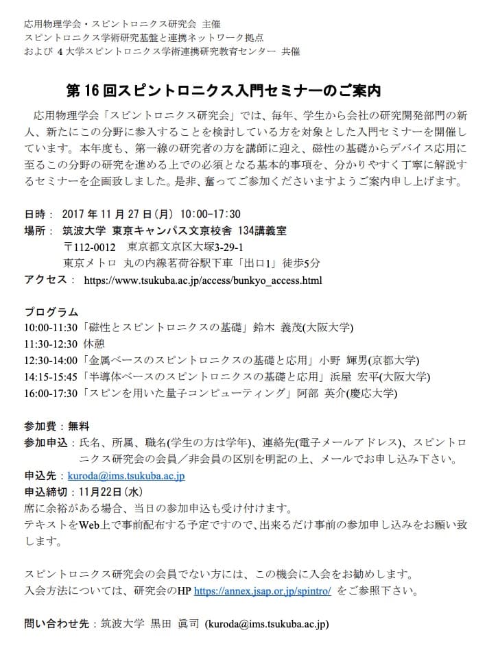 | 参加申込 | 氏名、所属、職名(学生の方は学年)、連絡先(電子メールアドレス)、スピントロニクス研究会の会員/非会員の区別を明記の上、筑波大学 黒田 眞司 (kuroda@ims.tsukuba.ac.jp) 宛にメールでお申し込み下さい。 |