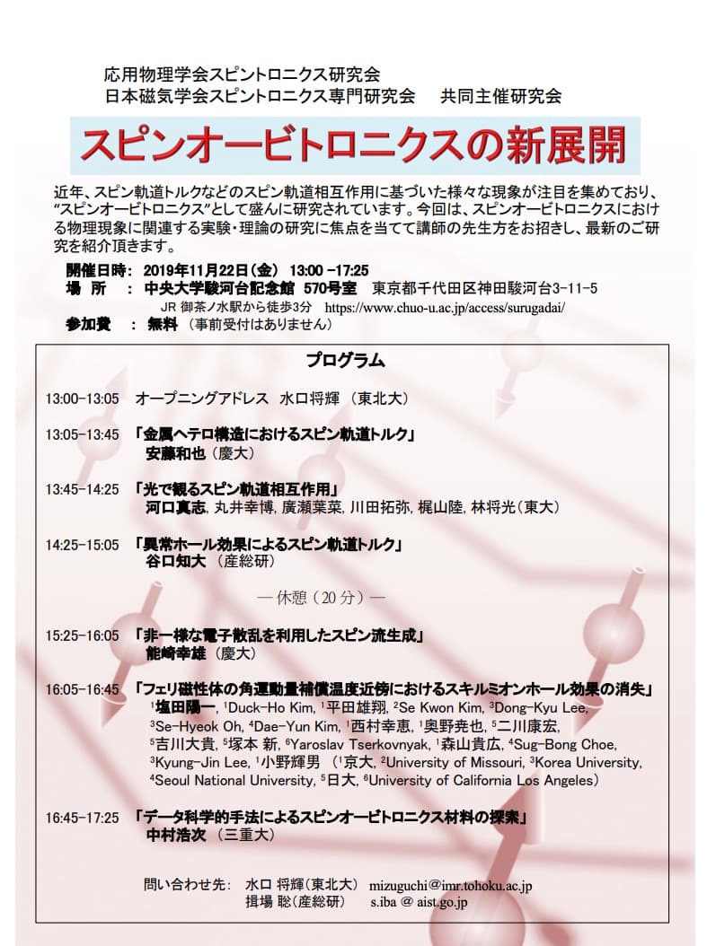 近年、 スピン軌道トルクなどのスピン軌道相互作用に基づいた様々な現象が注目を集めており 、スピンオービトロニクス として盛んに研究されています 。 今回は 、 スピンオービトロニクス における物理現象に関連する実験 ・ 理論の 研究 に焦点を当てて講師の先生方をお招きし 、 最新のご研究を紹介頂きます